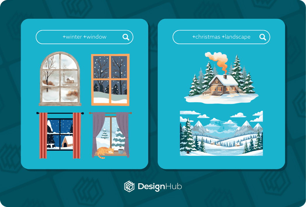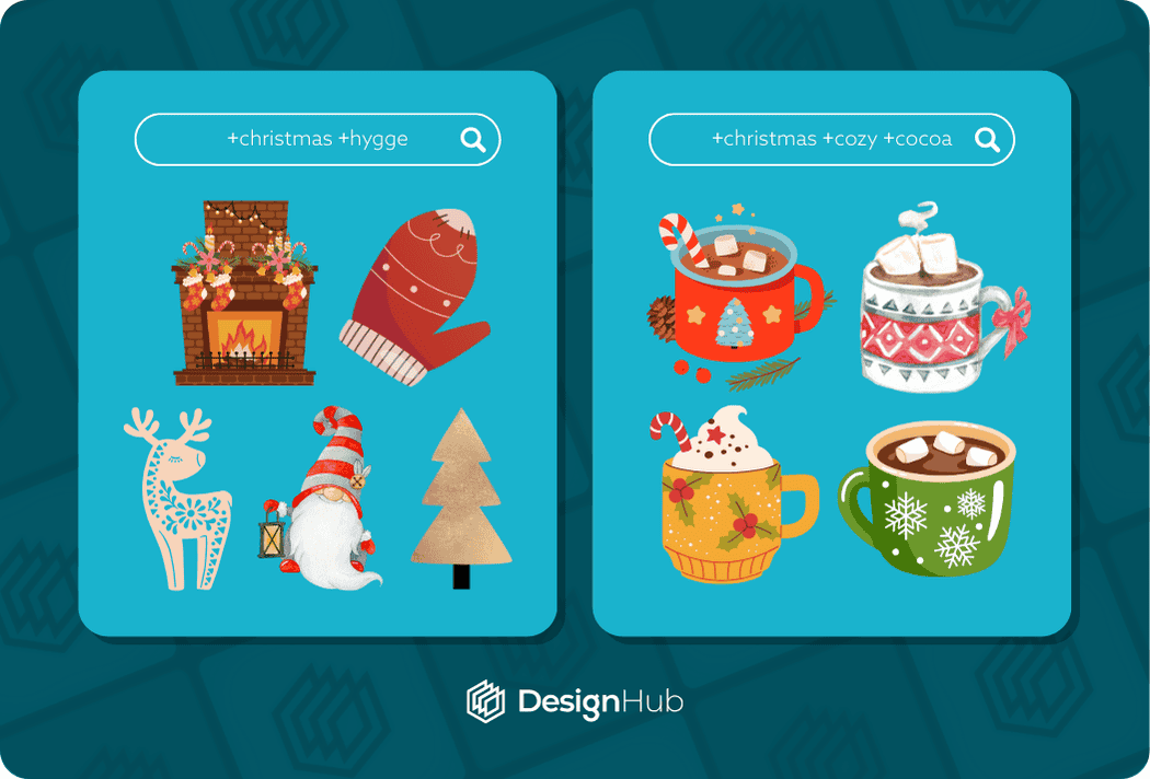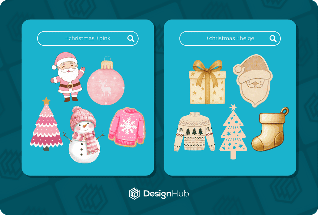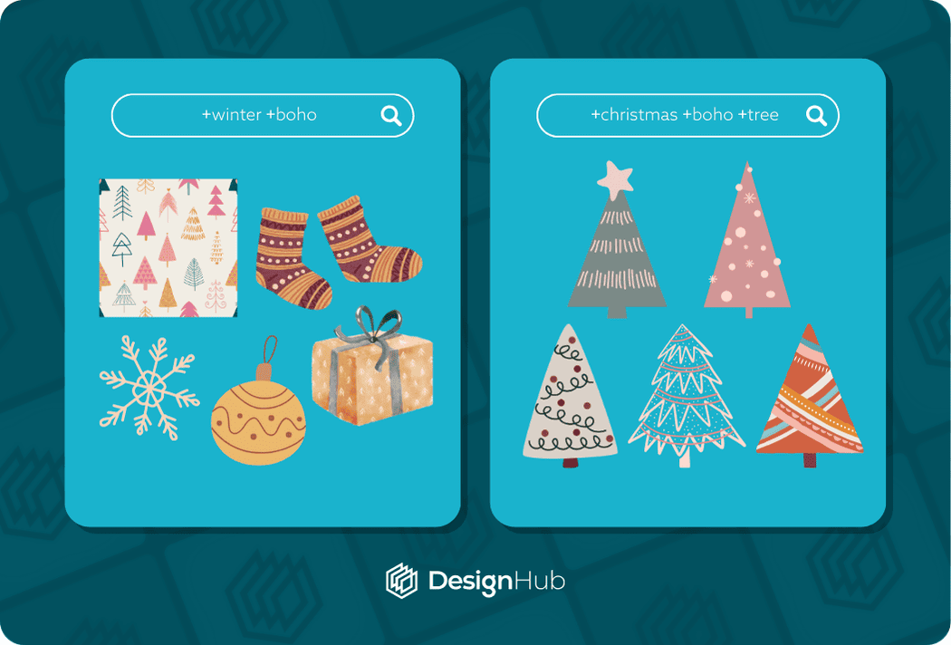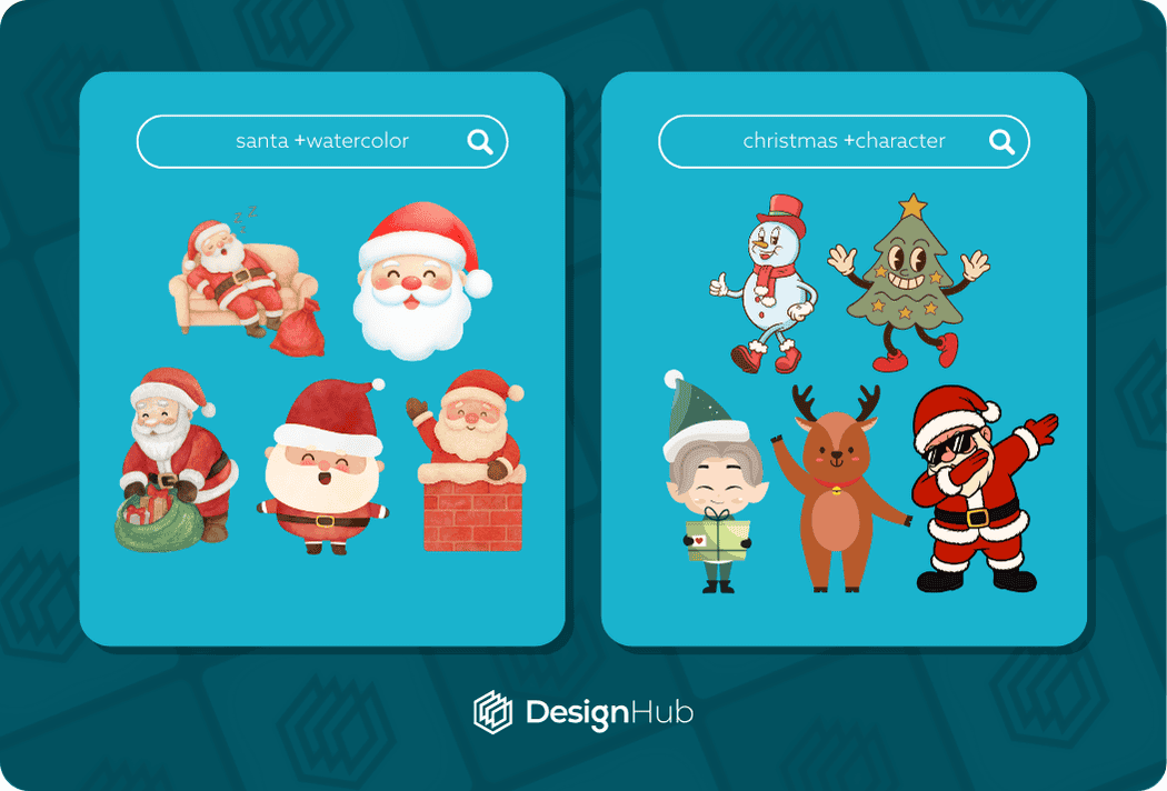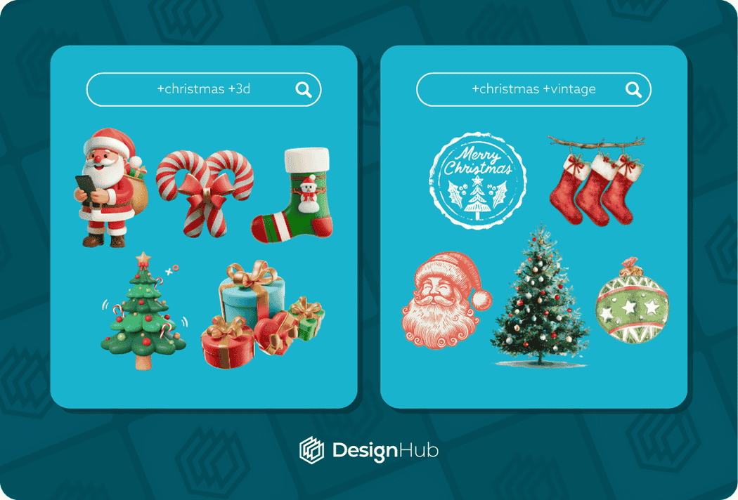 For example you might be looking for a Santa character but you want to find one in a retro style. You can also add +happy to find cheerful santa elements, so you’re search term becomes: “santa character +retro +happy”.
