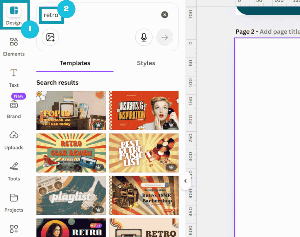 To do this, got to the design tab in the editor (1), input a relevant search term (2) and find some templates that you like the look of.