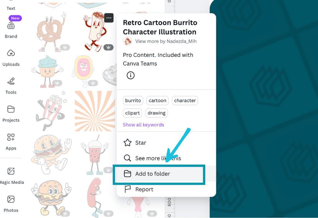 Go to an element that you want to save in the editor area, click on the three dots and click ‘add to folder’. From here you can either add them to an existing brand assets folder if you have one, or you can create a new folder to save all your favourite elements too.