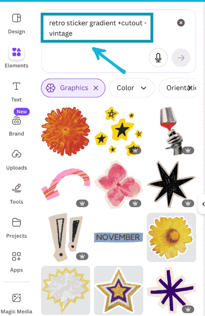 You can see below the difference in the search results for “Retro” vs “Retro sticker gradient +cutout -vintage”. It really narrows down your search results: