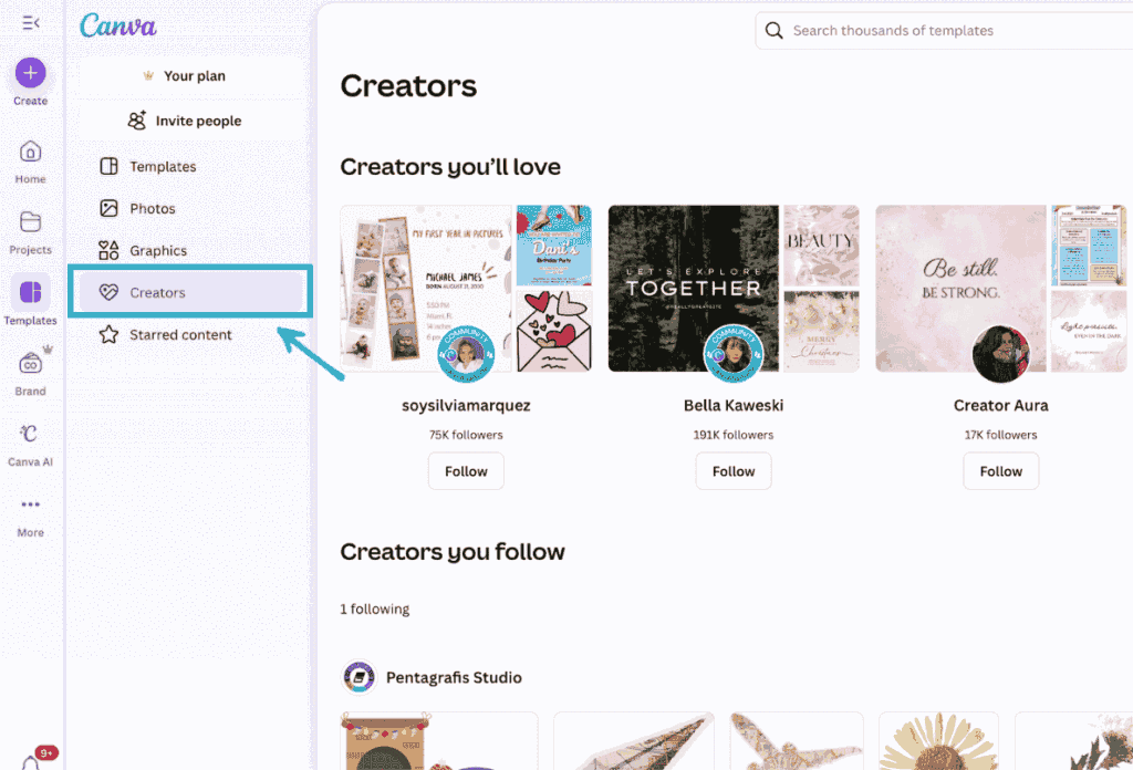 To see the creators you’re following, go to the ‘Creators’ tab under ‘Templates’ from your dashboard homepage.