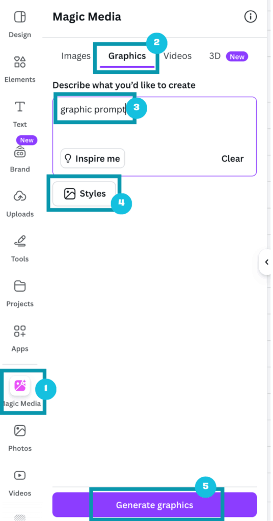 To do this, simply go to the ‘Magic Media’ tab (1), click on the ‘Graphics’ option (2), input your prompt in the description box (3), choose your preferred style (4) and , and click ‘Generate graphics’ (5).