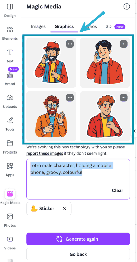 As an example, I put in this prompt “retro male character, holding a mobile phone, groovy, colourful”, chose sticker style and got these results: