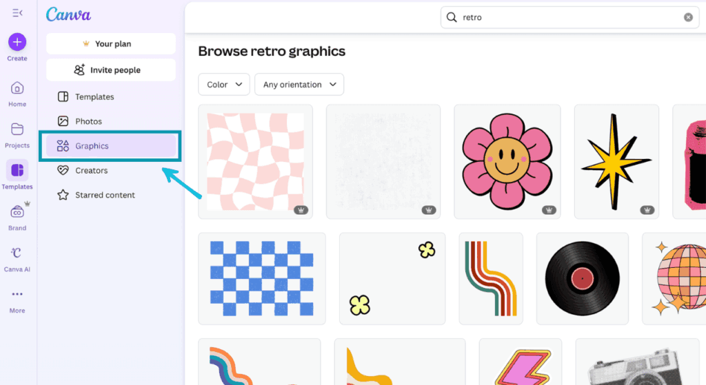 From your Canva dashboard homepage, go to the ‘Templates’ tab, select ‘Graphics’, and from here you can search for specific elements that you’re after.