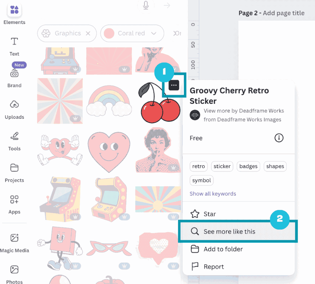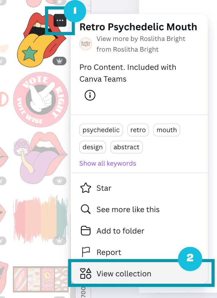 You might come across a Canva element that really fits with the style you’re looking for. You can click on the three dots that appear when you hover your cursor over an element (1), then click on the ‘View more by “designer” option (2):