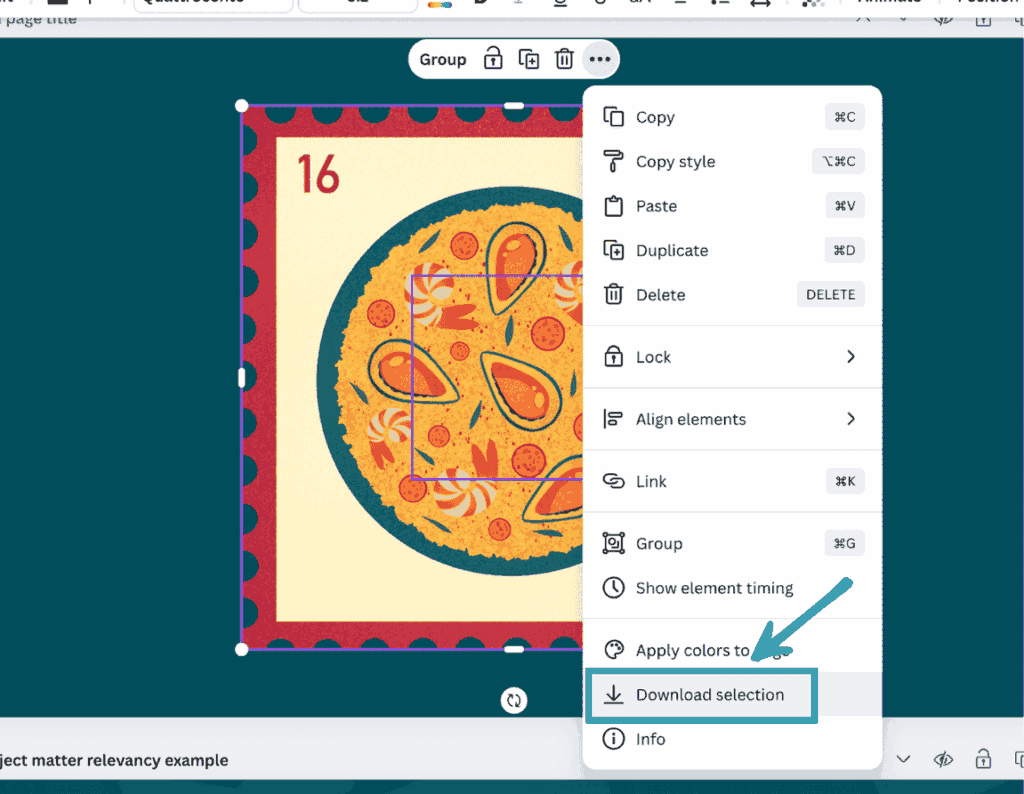 I’ve then dragged my cursor and selected both the element and the shape at the same time, clicked on the three dots, and chose ‘download selection’ (you need at least two elements to get the download selection option’: