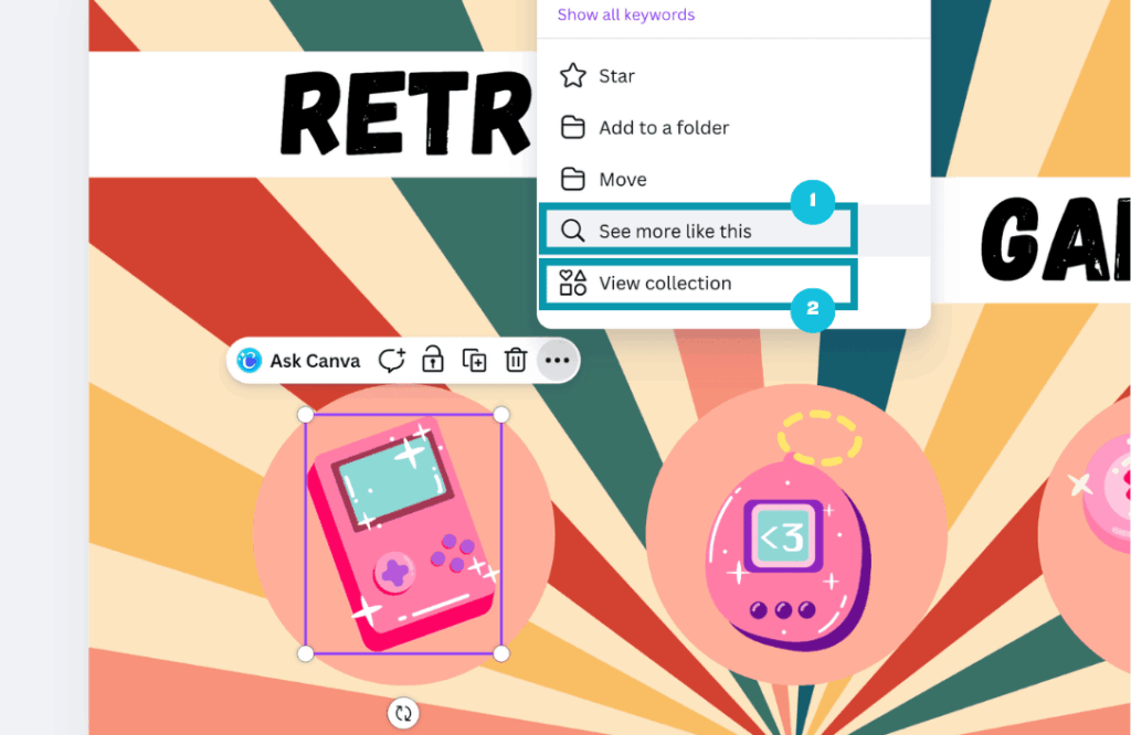 Within Canva you can also discover more keywords by clicking on the three dots when hovering over an element, and you see what keyword labels that item has.